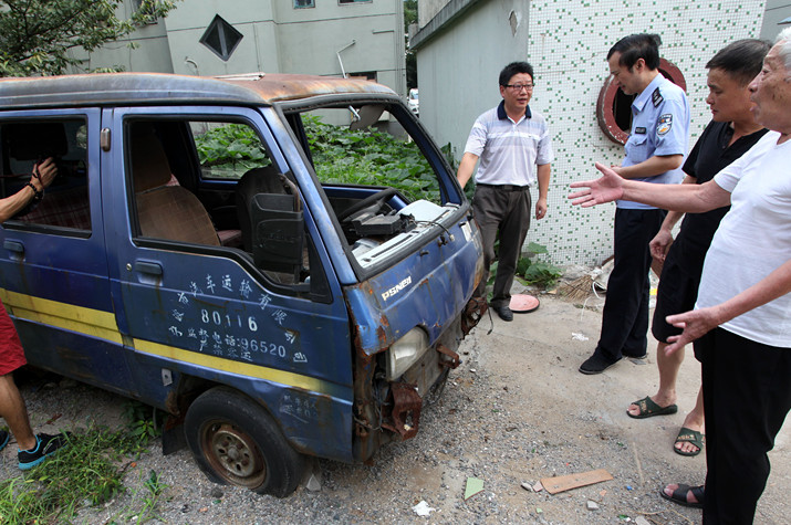 昨天下午,海曙區白云街道聯南社區居民正在告訴交警這輛已在社區停泊5年以上的貨車。(胡建華 攝)