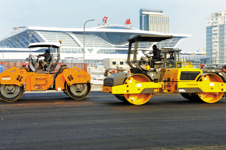 昨天,在新火車南站南廣場前,工人們正忙著為站前馬路鋪瀝青。記者龔國榮攝