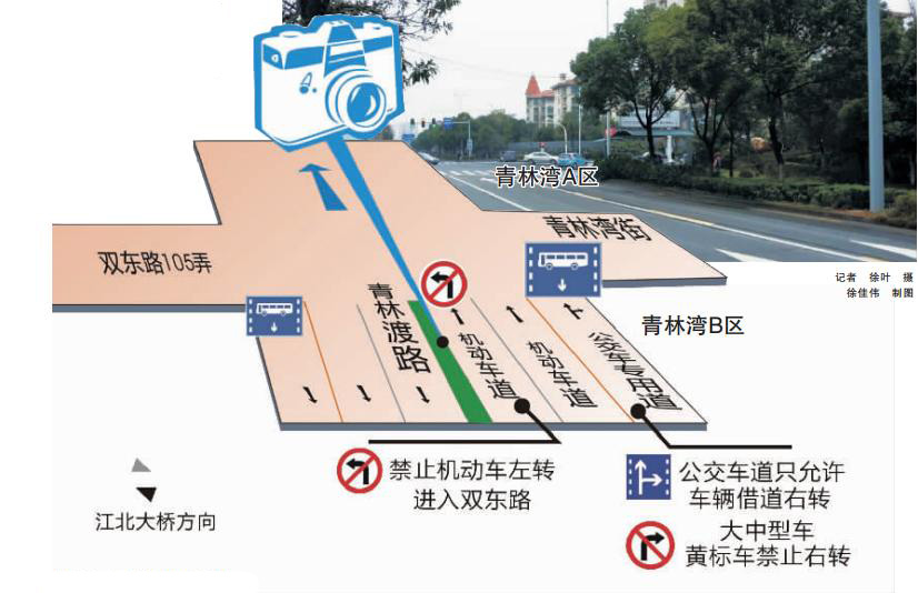 昨天,市民王先生稱,公交專用車道啟用后,青林渡路左轉(zhuǎn)進入雙東路105弄就被禁止了(如圖),使得片區(qū)交通受到影響,不知道有關(guān)部門是否能微調(diào)交通設(shè)計方案。記者昨日調(diào)查,發(fā)現(xiàn)這小小的“禁左”標志,也讓相關(guān)部門為難。