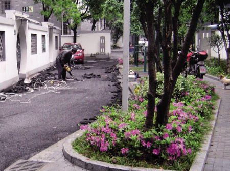 記者發現小區里瀝青路面起砂、坑洼現象很是普遍。施工人員告訴記者,他們從上星期剛開始道路修補施工,下一步會對刨開的地方重新鋪設瀝青。