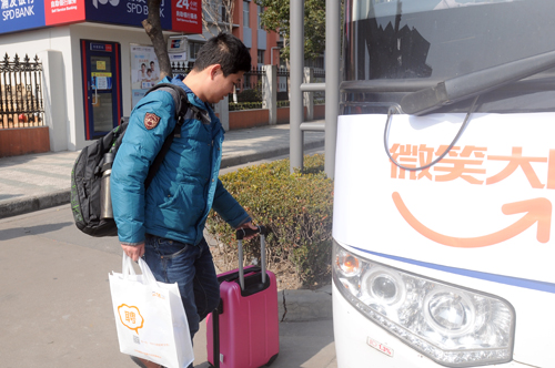 中國寧波網(wǎng)訊 在江北莊橋務(wù)工的湖南小伙小蔣乘上了前往火車南站的“微笑大巴”。小蔣說:往年回家,到火車站的距離最為頭疼,行李多,公交車不方便,打車又不劃算。