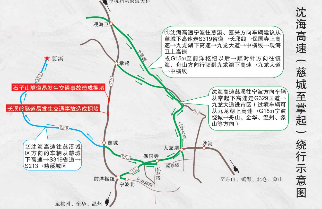 如遇象山港大橋封道,甬臺溫高速復線寧波往象山車輛建議咸祥下高速→沿海中線→S214往寧海方向→寧海北上G15高速→寧海下高速→S311往象山方向;寧波往象山方向車輛建議咸祥下高速→沿海中線→S215→橫山碼頭→象山輪渡→象山。