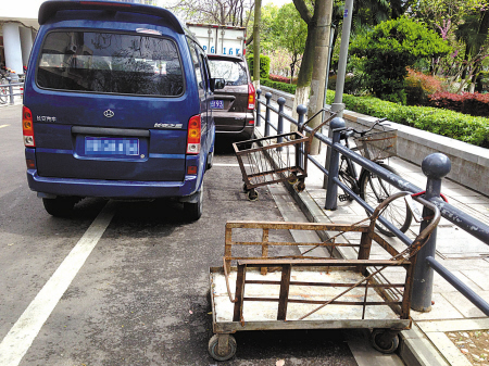 據面包車司機和一些買菜的群眾講,因為這一帶車位緊張,有的沿街商戶為了貨車來時卸貨方便,便用推車等雜物放在就近的停車位上,占一個臨時“卸貨位”,“這種情況經常看到,上午下午都有,已成常態。這些人方便了自己,卻把免費停車位變成了‘私有’,給來買菜或辦事的人停車帶來不便。”