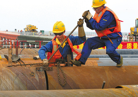 寧海縣三門灣跨海大橋海上施工平臺,工人們正為橋墩建設做準備。目前,概算投資126億元的三門灣跨海大橋及接線工程前期施工進展順利,本月起,8個項目部將進行海上、隧道及路基施工。