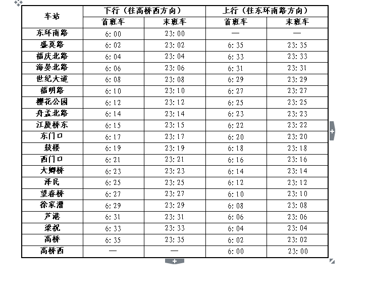 車站工作人員溫馨提醒:跨年夜當晚,東門口站往高橋西方向末班車時間23:17,往東環南路方向末班車時間為23:20;鼓樓站往高橋西方向末班車時間為23:19,往東環南路方向末班車時間為23:18。請趕末班車的乘客預留好進站、購票的時間,以免錯過列車。