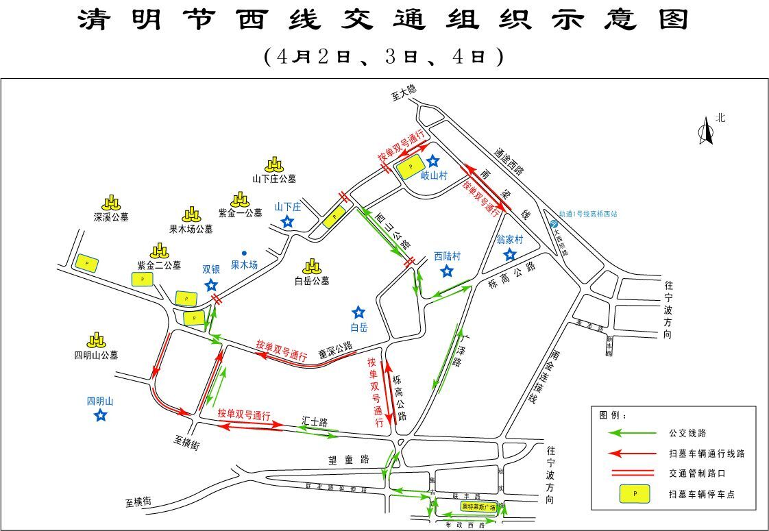 4、前往山下莊掃墓的小型客車一律按單雙號,從甬金連接線、甬梁公路(中山西路)、岐山村路口進入山下莊停車場停放,再經原路駛出。禁止機動車(除公交車外)在西山公路通行。