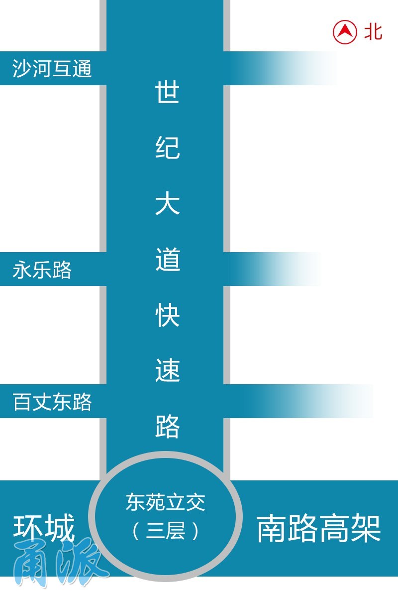 世紀大道快速路及北延工程分三期進行。一期:東苑立交到百丈東路。二期:百丈東路到永樂路。三期:永樂路到繞城高速沙河互通。