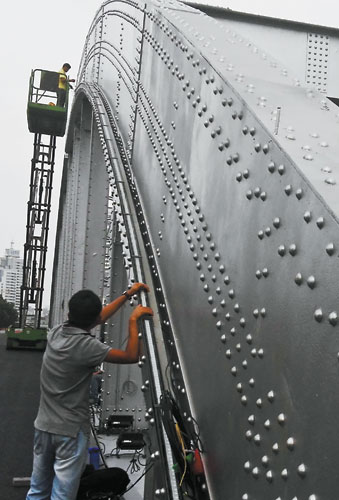 同時,還進行了12根橫梁和吊桿的對接鉚接,110余根縱梁的鉚接,上萬套高強螺栓的栓接,以及橋面板約300多米焊接等安裝工作,并于6月下旬進入橋面瀝青的鋪設階段。