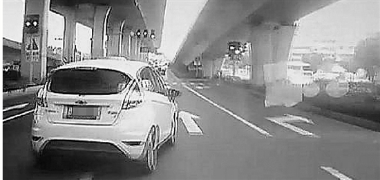 從視頻上看,周先生通過路口后,有一個向右側變道的舉動。變到一半時,右后方一輛寧波牌照的白色福特轎車快速超了上來,連續兩次別車,最后直接停了下來。大約2秒后,白色福特才繼續前行。