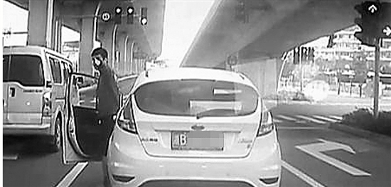 隨后,兩車來到路口,遇到紅燈。白色福特停車,司機走下車來指著周先生說了幾句什么,然后回到駕駛室。
