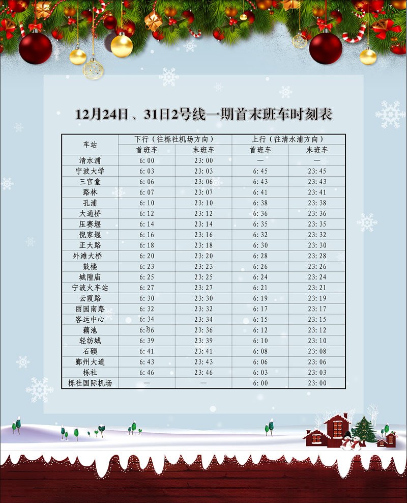 今天(12月21日)寧波市軌道交通集團有限公司運營分公司發布了一則貼心的通告:12月24日、12月31日這兩天,寧波地鐵全線執行特殊日時刻表,末班車延長至23點。