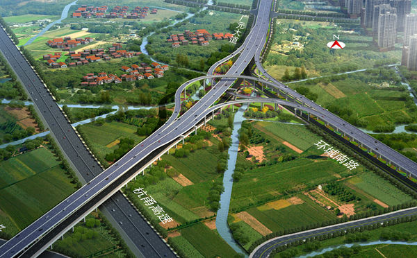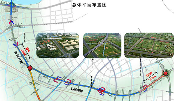 高架主線東接一期工程薛家南路路口高架主線,西至秋實路環城南路立交,標準寬度25.5m,沿線設置3對平行匝道,秋實路-環鎮北路段道路寬度51-83m。高架主線南接秋實路環城南路立交,北至15米規劃河道進入地面段,至秀豐路秋實路交叉口進入隧道段,高架主線標準寬度25.5m或32.5m,隧道段標準寬度29m。