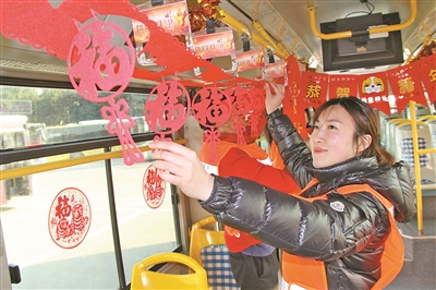 紅紅的“!弊执盎、連串的燈籠、喜慶的卡通狗……昨天早上,市公交鎮海公司“青年文明號”志愿服務隊給一輛外來務工人員定制專線車換上了喜慶的“新裝”,公司還將增加開水提供、行李搬運、問詢指路等志愿服務,盡最大努力讓乘客順利回家。