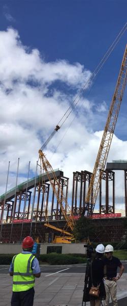 寧波軌道交通2號(hào)線二期工程建設(shè)迎來(lái)重大突破!8月14日早上10點(diǎn),在2號(hào)線二期高架段的拱橋施工現(xiàn)場(chǎng),拱肋吊裝正加緊進(jìn)行,工人們高空施工汗如雨下。一輛400噸狀似“坦克”的履帶吊車正將一段重達(dá)30多噸的拱肋吊到30多米高空,跨越大運(yùn)路石油管廊的拱橋拱肋進(jìn)入了合龍階段。