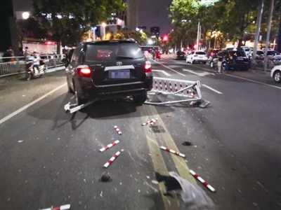 接到報警后,交警立即趕到現場,只見路中間的隔離護欄碎了一地,肇事車是一輛黑色SUV豐田轎車,停在一旁,前保險杠斷裂,車頭引擎蓋明顯凹陷進去。