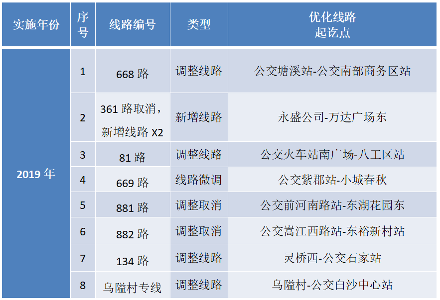 2019年將實施線路8條,包括接駁線路優化7條,新開線路1條。