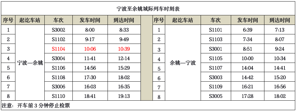 寧波城鐵發布消息,從12月30日起,寧波至余姚、紹興城際鐵路將執行新的列車時刻,其中有一個變化就是:S1104次寧波站發車時刻調整為10點06分,這就填補了寧波至余姚列車上午10點檔的空白。