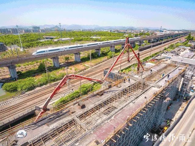 目前,25孔簡支箱梁已全部完成,慈城站正在進行機電設備安裝及裝修施工。節點工程慈城站至官山河站區間的轉體橋已完成懸臂現澆施工,正在進行轉體前的各項準備工作,將于近期完成轉體。