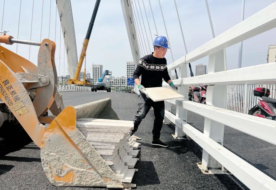 大橋兩側的人行道正在鋪裝;護欄在打磨后,進行著最后的焊接;兩臺曲臂高空作業車護送工人抵達大橋上空,進行燈光調試……4月3日上午,橫跨奉化江面的新典橋項目正在進行收尾工作,有望于4月底通車。