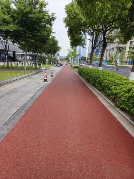 最近,家住江南春曉的市民朱先生驚喜地發現周邊的非機動車道變了樣,面貌煥然一新!原先的路面經過翻新變成了醒目的紅色,非機動車駛過嶄新平坦的路面也更加安全。路過附近,記者還看到道路上布置的鮮艷國旗,與周邊綠植、樹木相得益彰,十分怡人。