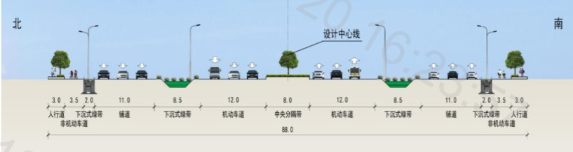 快速路主線布置為雙向6車道,設(shè)計(jì)車速為80公里/小時;地面輔道建設(shè)規(guī)模為雙向6車道,設(shè)計(jì)車速為50公里/小時。高架段標(biāo)準(zhǔn)斷面寬度50米,地坪段標(biāo)準(zhǔn)斷面寬度88米。