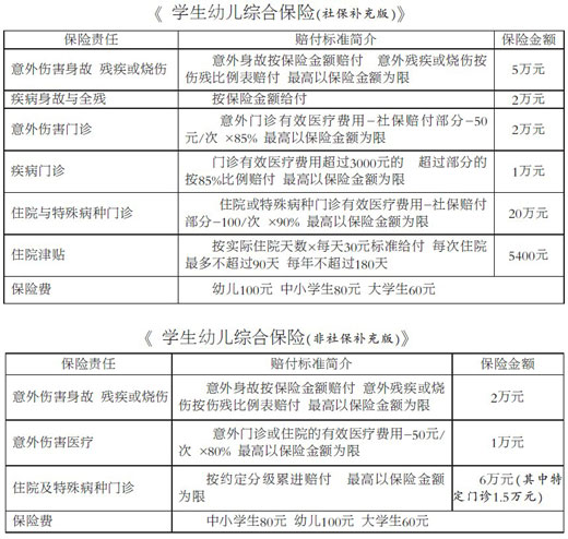 對(duì)比兩個(gè)方案發(fā)現(xiàn),盡管保障額度各有側(cè)重,但是兩種承保方案的保費(fèi)是一樣的,大學(xué)生為60元,中小學(xué)生為80元,幼兒園幼兒為100元。