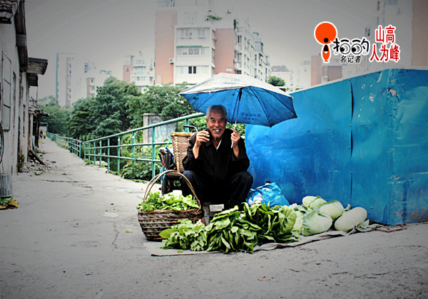 大爺在路邊守攤賣自己種的青菜,自產自銷,倒也樂在其中!