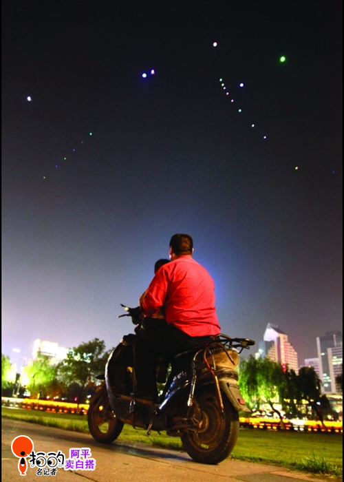 前不久的一天晚上,在三江口的草坪上,遇到這對父子,父親騎著電瓶車,帶著兒子在看夜光風箏,讓我感覺很溫馨。