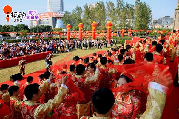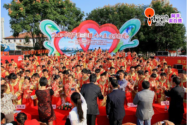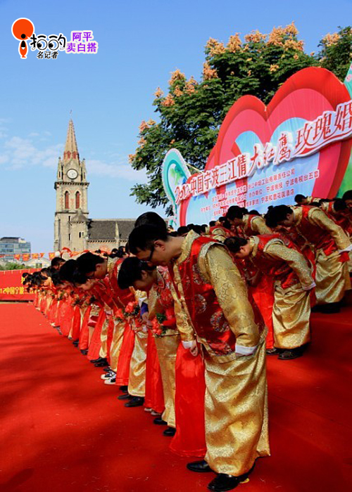 中國寧波網(wǎng)“i拍”記者阿平賣白搭:愛在寧波、情到永遠。2012中國寧波三江情大紅鷹玫瑰婚典10月20日在寧波老外灘隆重上演。