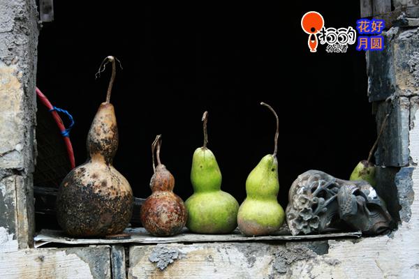 幾個葫蘆被主人零散地放在破舊的窗臺上,前面幾個葫蘆一身的綠早已褪去,在不知不覺中也風干了,輕了很多,稍稍晃動,能聽得見里面干結脫落的籽嘩啦啦響。