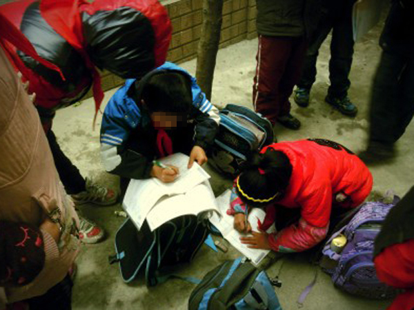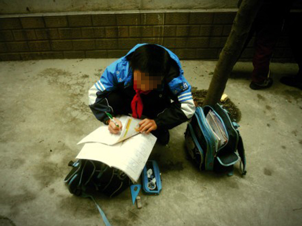 中國(guó)寧波網(wǎng)“i拍”記者山高人為峰:2012.12.20,陰,清晨,寒風(fēng)中,徐戎路上,有小學(xué)生在路邊趴在書包上寫作業(yè),遠(yuǎn)看是在“認(rèn)真”地做著作業(yè),近看,卻是在照著同學(xué)的答案抄寫……原來做作業(yè)是可以這樣互相“學(xué)習(xí)”的,誰(shuí)之過。