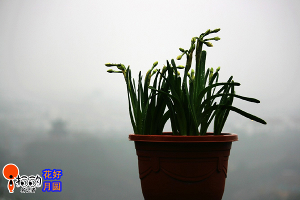 鎮(zhèn)海招寶山爬山時(shí),看到觀音閣的護(hù)欄處養(yǎng)著一盆水仙,從遠(yuǎn)處看霧氣迷茫,顯得這盆水仙異常美麗。