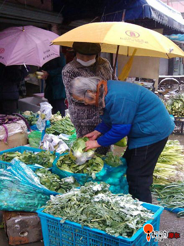 中,老爺爺為挑菜的老奶奶打傘,這一刻,見證真情。