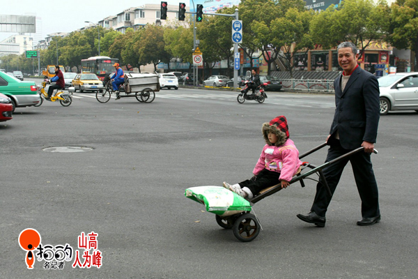 馬路上,大爺推著車,載著大米,悠然信步,小女孩坐“專車”,一路淡定看風景。