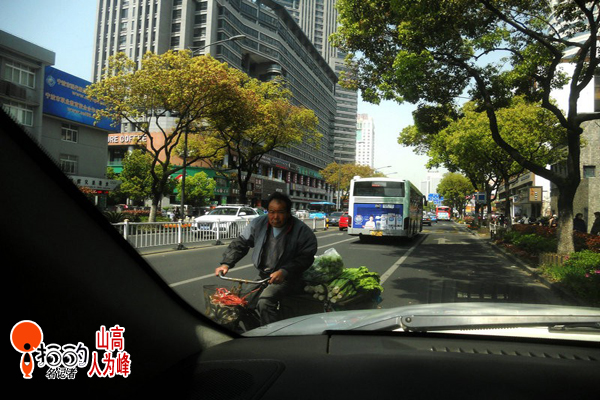 2013、4、10,晴。江東百丈路上,賣菜大爺的小三輪車,不僅僅只是逆向,而且是在機動車道上的車流中逆向騎行......大爺,你“牛”,我停車讓你走,行了吧!