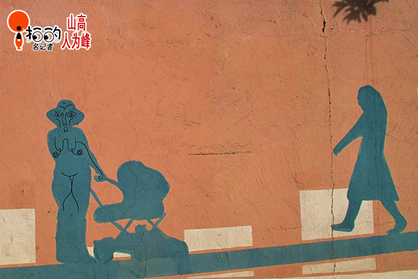 2013、7、22、晴。江東徐戎路墻體的繪畫上,有好事者,“畫龍點睛”,讓推童車的母親變成了“八戒”大媽......
