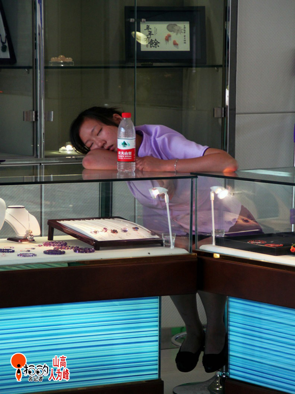2013、8、9、晴。甬城,室外超40℃,室內25℃,有水,有空調,妹子睡得正香......小心商品被盜啊!