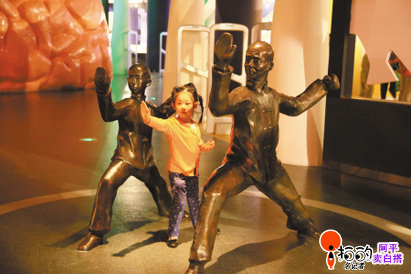寧波文化廣場,一個小朋友模仿兩個雕塑,也在打太極。