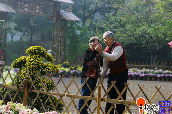 老人用手機拍到了一叢美麗的菊花而忙拉著老伴欣賞,那種溫馨、祥和、幸福、快樂瞬間定格在濃濃的秋景里!