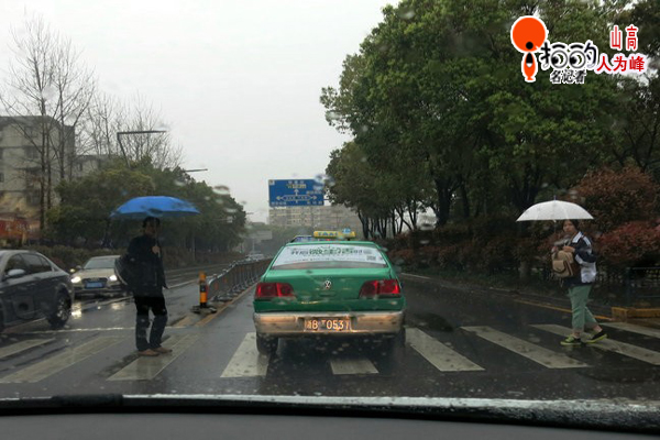 2014、3、28、陰雨。雨天開車須慢行,莫讓雨水濺行人,斑馬線前先讓人,行人車輛都安全。