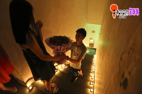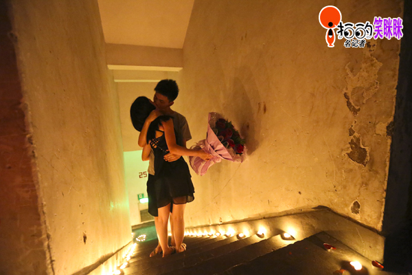 上前一問得知小伙子姓周,今年20歲來自安徽,租住在這座大樓里,在寧波做手機業工作。他想在今年77情人節來臨前給女朋友一個驚喜,特意從網上訂購了很多蠟燭和鮮花,準備晚上向他的女朋友求婚。但因為樓高風大,蠟燭很難點燃,這時有幾位住在這個樓的小姑娘都上來給小伙子幫忙,使這個浪漫求婚夜更加溫馨感人。