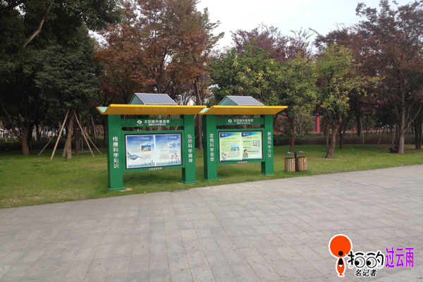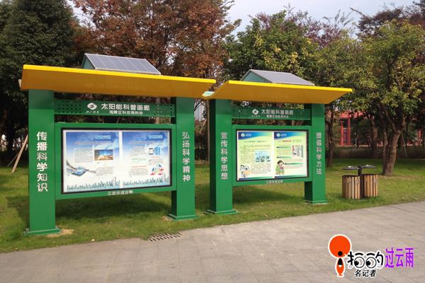 中國寧波網“i拍”記者過云雨:攝于寧波濠河公園。兩座美麗的太陽能科普畫廊正在發揮它的作用,太陽能科普畫廊頂部安裝了太陽能電池板、感應器、蓄電池等配件。太陽能科普畫廊主要采用圖片、漫畫的形式向群眾傳播大量科普知識。太陽能科普畫廊成寧波宣傳節能、倡導低碳的一道亮麗風景線。
