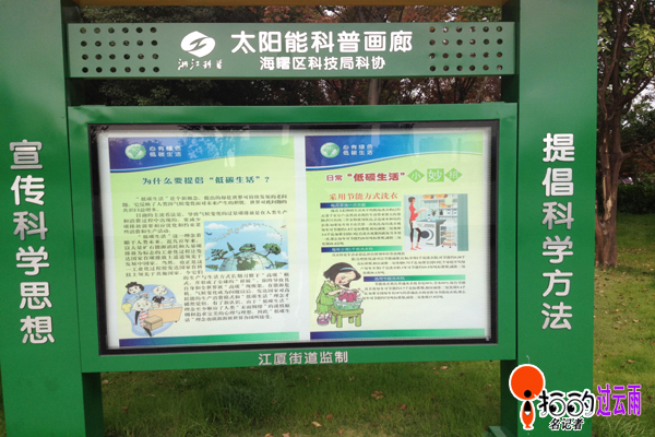 中國寧波網“i拍”記者過云雨:攝于寧波濠河公園。兩座美麗的太陽能科普畫廊正在發揮它的作用,太陽能科普畫廊頂部安裝了太陽能電池板、感應器、蓄電池等配件。太陽能科普畫廊主要采用圖片、漫畫的形式向群眾傳播大量科普知識。太陽能科普畫廊成寧波宣傳節能、倡導低碳的一道亮麗風景線。