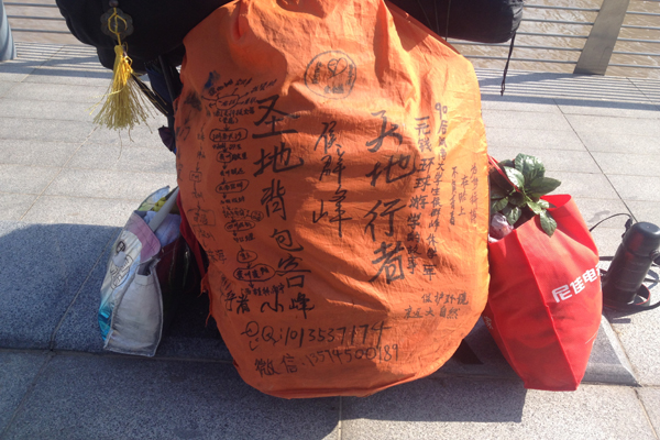 這個90后小伙子自稱“圣地背包客”,他笑著對我說:“其實,這次出來收獲也是很大的,經常會有熱心的人給我充手機話費,也常常能遇到很多肯讓我們搭順風車的司機,送達目的地后還請我們吃飯呢;這一路過來啊,我們沒有花費一分錢的車錢。”他還說起一個有趣的事,有一次在長沙有個公交車司機看見他后連忙把公交車停住路邊,下車跟小伙子握手對他連連稱贊,最后還贊助了他50元錢。