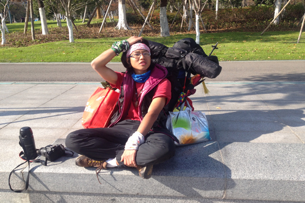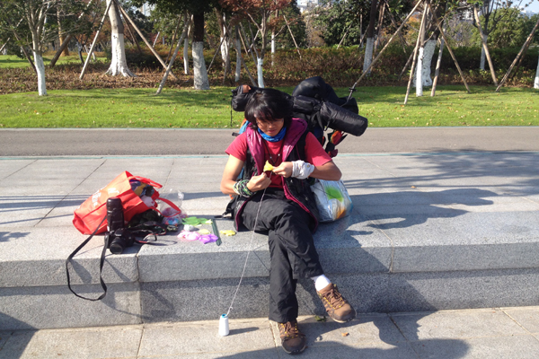 中國寧波網“i拍”記者過云雨:12月5日中午,寧波濠河公園里來了一個年輕的背包客,戴著眼鏡斯斯文文,頭上纏著時尚頭巾,大冷天卻只穿著單薄的短袖,一臉燦爛地笑著。他叫侯群峰,今年22歲,是湖南人文科技學院大三英語專業的學生。在申請臨時休學后,他和他的小伙伴林小堅計劃環游全中國和20個國家,在國內要先走完15000公里。問起他的目的,他說要趁年輕好好磨練自己意志,邊走邊了解當地的民俗文化,如果途中遇到需要幫助的人他會毫不猶豫地伸出援手。