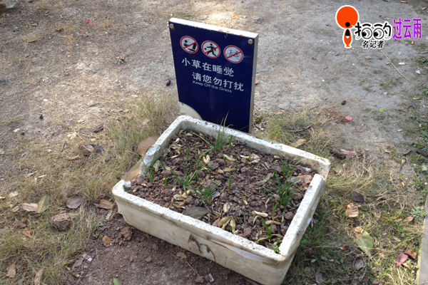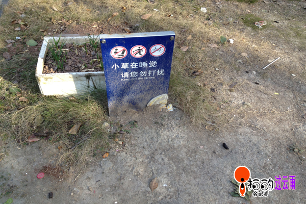 某小區的草坪提示語與現實情況形成了鮮明的對比,提示語周邊的草坪被踐踏得幾乎寸草不生,愛護草坪從你我做起,別讓小草無處可睡!