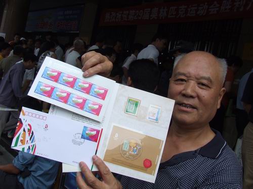 寧波市郵政局郵票公司經(jīng)理李嵐說,當(dāng)天上午8點全國統(tǒng)一發(fā)售奧運會開幕式郵票,寧波就在天寧大廈郵政支局設(shè)了一個發(fā)售點。當(dāng)天發(fā)售的除了奧運會開幕式郵票外,還有10幾種奧運主題的紀(jì)念封、首日封、明信片、郵折、郵冊等。