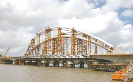 在今天全橋合龍后,大橋主體結(jié)構(gòu)施工完成。接下來,將進(jìn)行橋面附屬結(jié)構(gòu)及配套工程的施工。 |