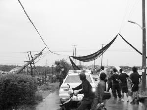 昨天下午5時30分左右,江北甬江街道外漕村814公交車站旁發生多根高壓電線桿倒塌事件。據目擊者介紹,當時突然狂風大作,附近田地里的一塊黑色大篷布被風吹起后,正好掛在了高壓電線上,導致整條線路的多根電線桿不同程度倒塌。截至記者發稿時,電力部門還在進行全力搶修。 |