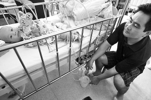 9月13日,在上海新華醫院兒科病房,王文樹為不滿周歲的兒子王小龍清理尿液。